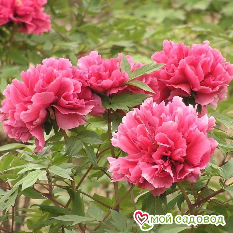 Пион древовидный — морозоустойчивый кустарник, достигающий высоты до 2 м, с крупными ярко-зелеными листьями. На одном кусте может быть от 30 до 70 цветков. Диаметр каждого от 20 до 25 см. Продолжительность цветения 12—14 дней. Растение декоративно и после цветения из-за необычной формы листьев. Пион неприхотлив, устойчив к болезням. На одном месте без пересадки может расти более 20 лет.